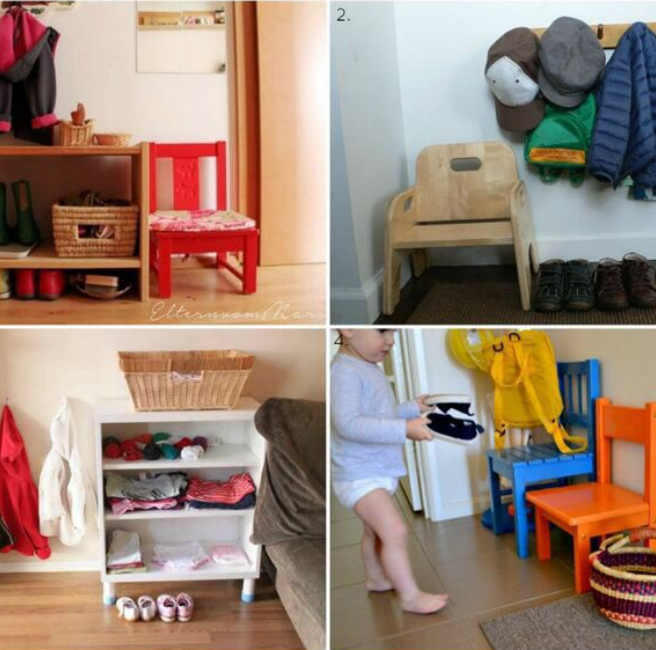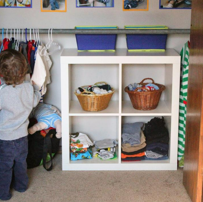 - Низкие шкафчики или полочки с одеждой ребёнка. Очень важно, чтобы ребёнок мог сам достать до своей одежды, поэтому отдавайте предпочтение низким полочкам. Не выкладывайте сразу всю одежду, ребёнок можете выбирать из 3–4 комплектов, подходящих по погоде.