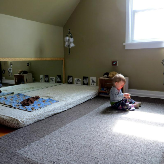 - Низкая кровать для сна. В педагогике Монтессори отдают предпочтение низкой кроватке, в которую ребёнок может сам лечь по своему желанию