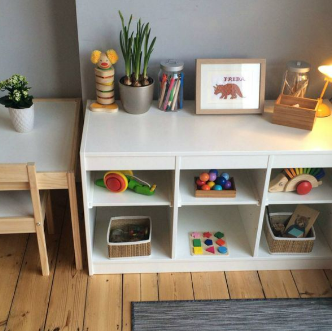 - Низкие полочки с Монтессори-материалами (или игрушками, материалами для творчества). Все материалы должны находиться на подносах, игрушки — в корзинках или коробках и быть разложены по группам (например, корзиночка с животными, коробка с «Лего» и т. п.).