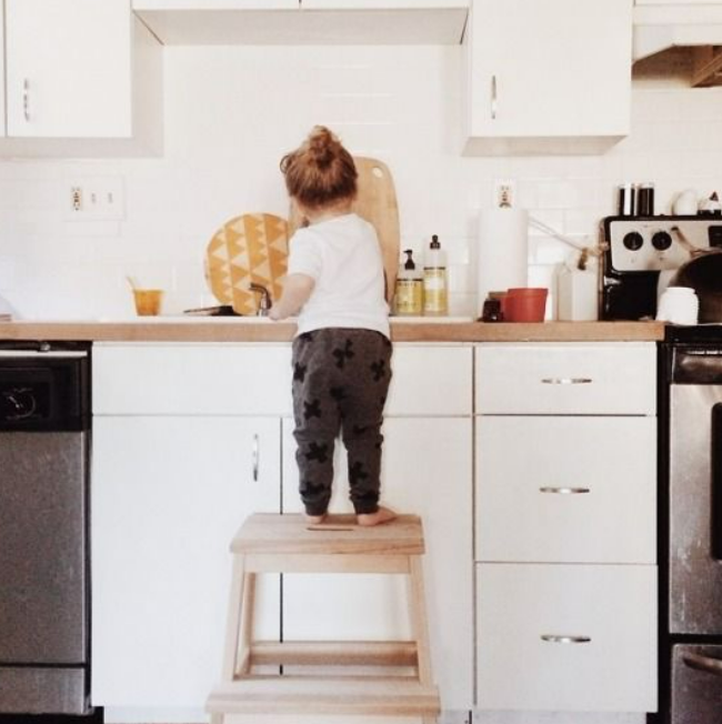 - Высокая скамейка или подставка, чтобы ребёнок мог доставать до рабочих поверхностей на кухне или до высоких полок. Такую подставку ребёнок должен иметь возможность переносить сам. Поэтому убедитесь, чтобы она была достаточно легкой.